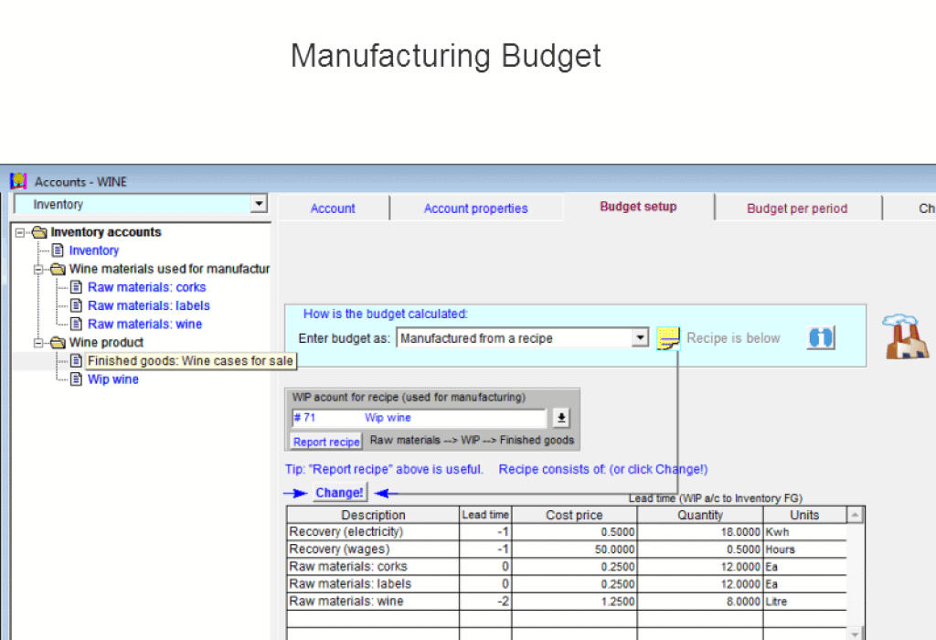 With budgeting and forecasting software for manufacturing, functionality for the ability to recover and capitalize overhead expenses in the manufacture of finished goods is necessary. Budget manufacturing is a niche requirement available in Visual Cash Focus from the Corporate edition upwards. With budget manufacturing you can calculate a “bill of materials” and manage raw materials, WIP and finished goods levels for any number of product lines.