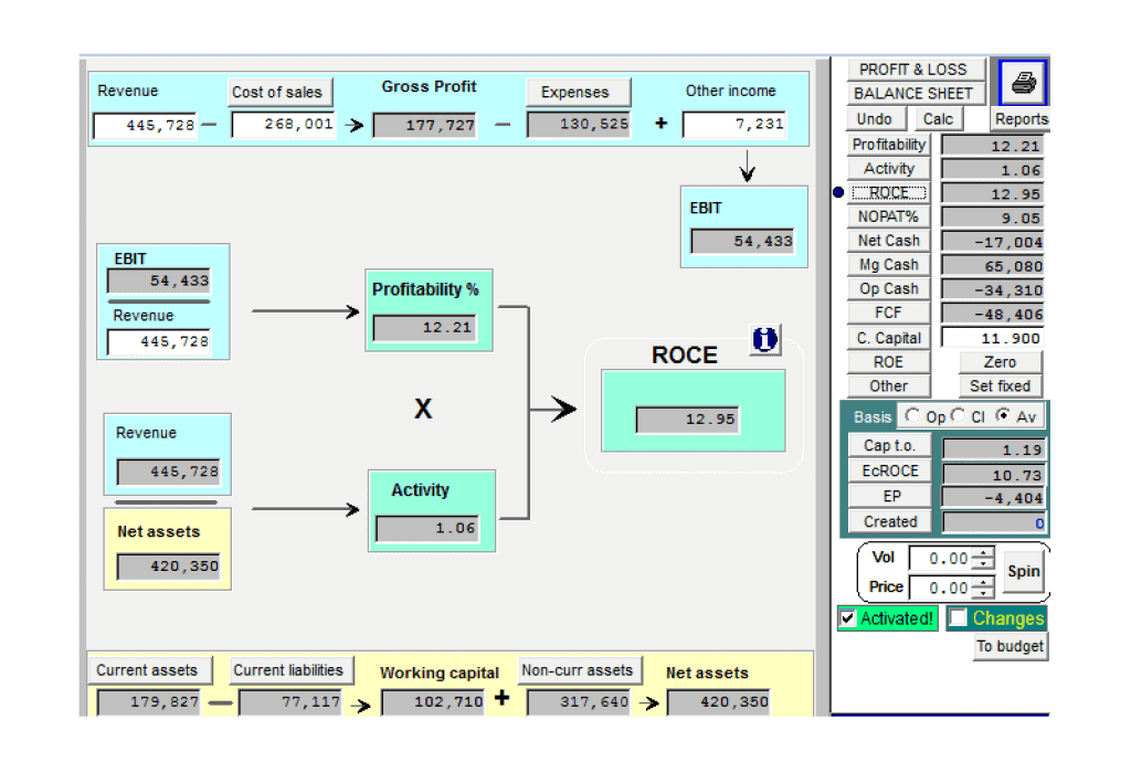 Models in Strategic Focus can cover both long and short term plans. The software indicates how any ratio used in the analysis of the financial statements is derived. For instance a quick overview of a plan shows that ROCE is 12.95%. However you can also drill deeper and see how this ratio is made up. Components in ratios can come from the Income Statement or Profit & Loss and the Balance sheet or both. Each account from the financial statements contributing to the ratio is displayed in a simple format. The software also provides a diagrammatic explanation of the ratio and how it was derived.