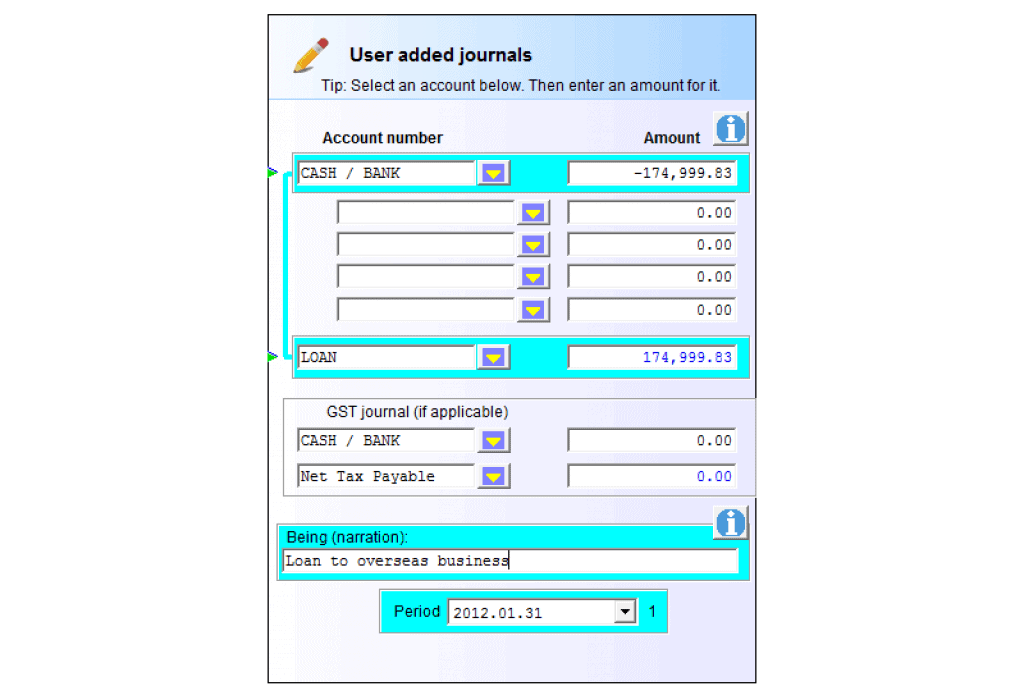In addition the user can add additional journals for any account. These journals will be brought in at the appropriate period. So if you add a journal affecting the account BANK then all consequences affecting BANK will be included when appropriate like for example interest charged